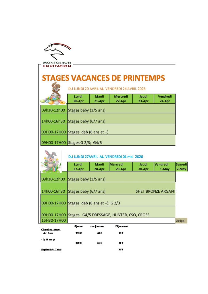 Le Poney-Club organise des stages à la journée (de 9h à 17h) ou en demi-journées (9h-12h ou 14h-17h), du lundi au vendredi.