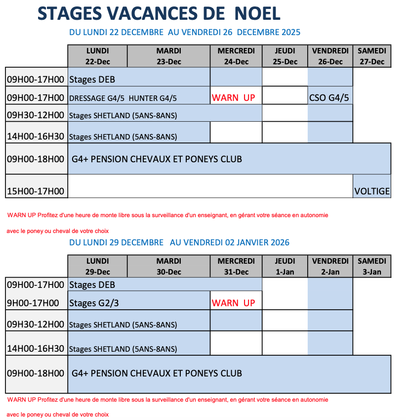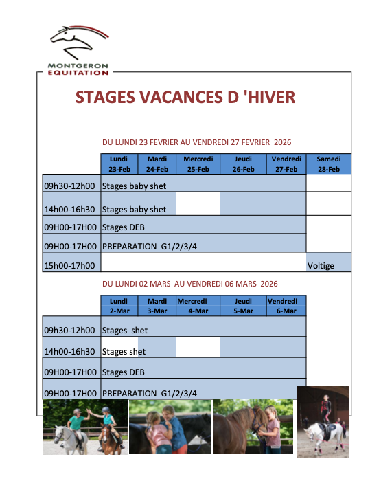 Le Poney-Club organise des stages à la journée (de 9h à 17h) ou en demi-journées (9h-12h ou 14h-17h), du lundi au vendredi.
